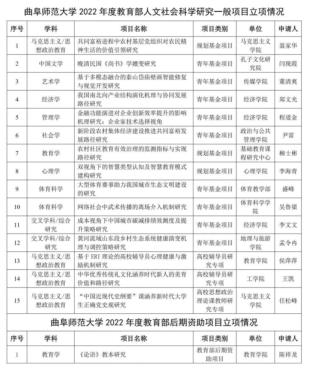 此外,2022年度教育部后期资助项目评审结果近日公示,全国共计101项入选,山东省属高校立项3项,来自我校教育学院的陈祥龙老师立项1项,这是我校近年来首次在此项目上实现突破。