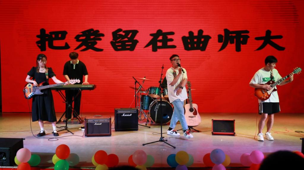 晚会在学院电声乐队带来的《启程》《你要跳舞吗》中拉开了序幕,带着对日月广场、知音湖的眷恋,把爱留在曲师大,带着梦想奔赴远方;爵士舞蹈、萨克斯四重奏《春之声》、男声九重唱《青春舞曲》《库斯科邮车》,用青春的朝气点燃激情的火焰,预示着毕业生们也将迎接一个崭新的春天,奏响曲园的骊歌。