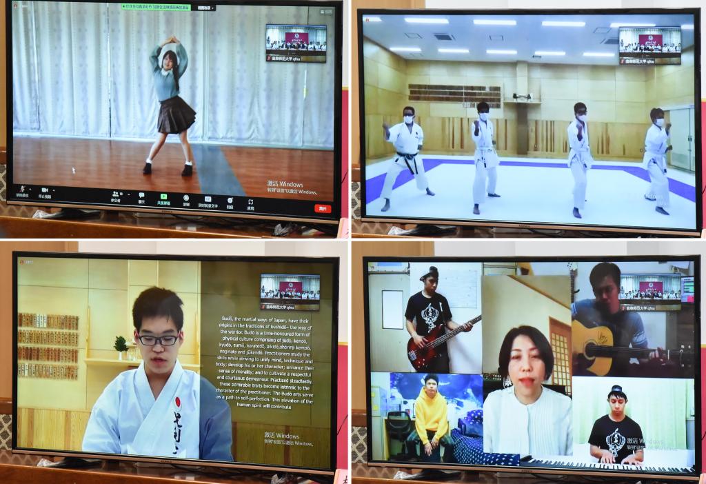 伴随着悠扬的音乐,一段精彩飘逸的儒风简韵舞拉开了师大学子们才艺展示的序幕,手拿书简翩翩起舞,古韵儒风,精彩绝伦;“山川异域 风月同天”书法展示苍劲有力,工整美观;设计精巧的汉服、琵琶,古琴,投壶,脸谱,剪纸等传统艺术纷纷呈现;欹器展示,体现传统中庸之道;精彩的太极表演,动作圆柔连贯、招式绵绵有力……书法、拓印、古琴、琵琶、汉服、礼仪、武术等丰富多彩的传统文化才艺展示赢得广泛好评。来自足利大学的同学们展示了动感活力的舞蹈,充满力量的空手道展示,师生齐唱《努力向上吧》,动听的旋律,让人回味。