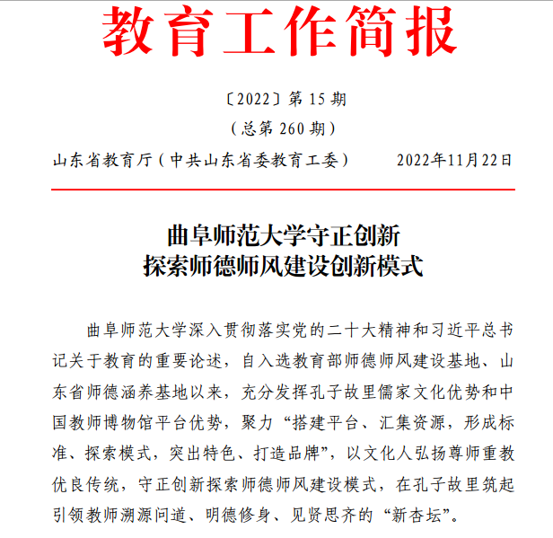 曲阜师大新闻中心讯(记者:袁玭 编辑:袁玭 责编:李文振) 11月22日,山东省教育厅《教育工作简报》2022年第15期专题刊发《完美网页版守正创新探索师德师风建设创新模式》文章,从“保护教育遗产,讲好师德师风故事” “发挥独特优势,开发师德教育资源” “研制特色课程,打造师德涵养高地”“增进国际交流,擦亮教师文化名片”四个方面,向全省教育系统介绍了曲阜师大以文化人弘扬尊师重教优良传统、守正创新探索师德师风建设模式的特色工作和典型经验。