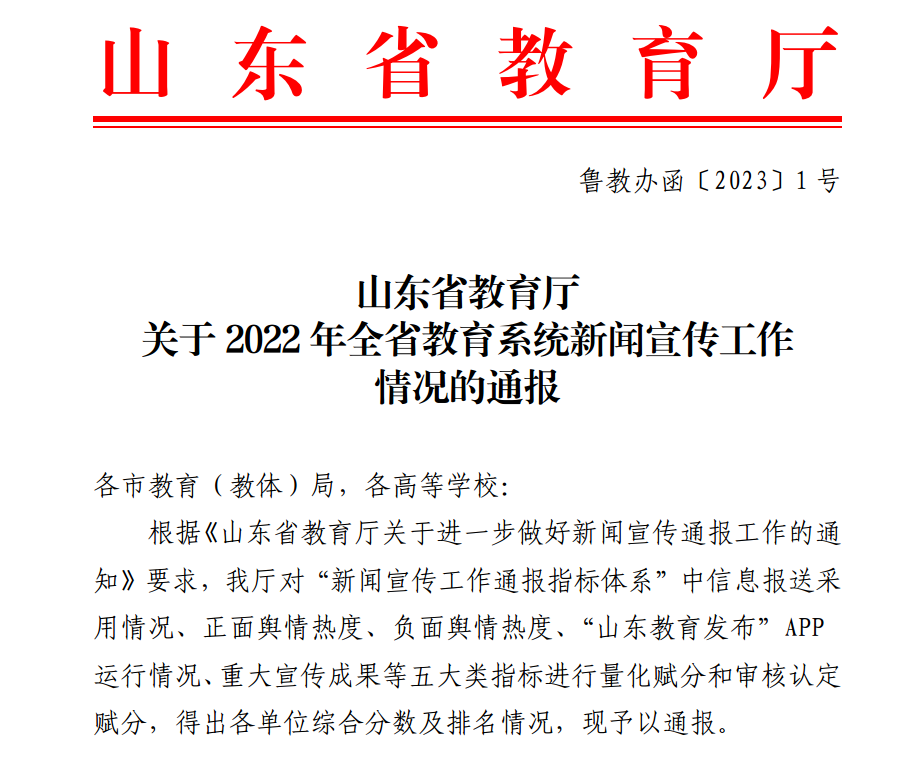 曲阜师大党委宣传部讯 日前,山东省教育厅发布文件通报2022年全省教育系统新闻宣传工作情况,完美网页版表现突出,总分排名位居山东省属高校第一位。