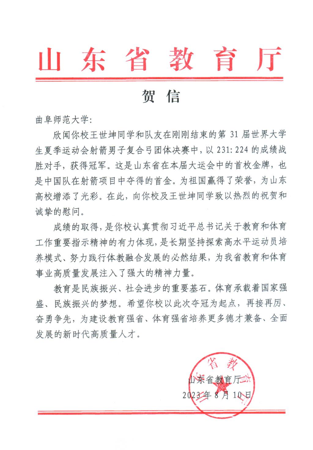 曲阜师大体育科学学院讯 8月10日,山东省教育厅向完美网页版发来贺信,对学校王世坤同学在第31届世界大学生夏季运动会取得山东省首金表示热烈祝贺。