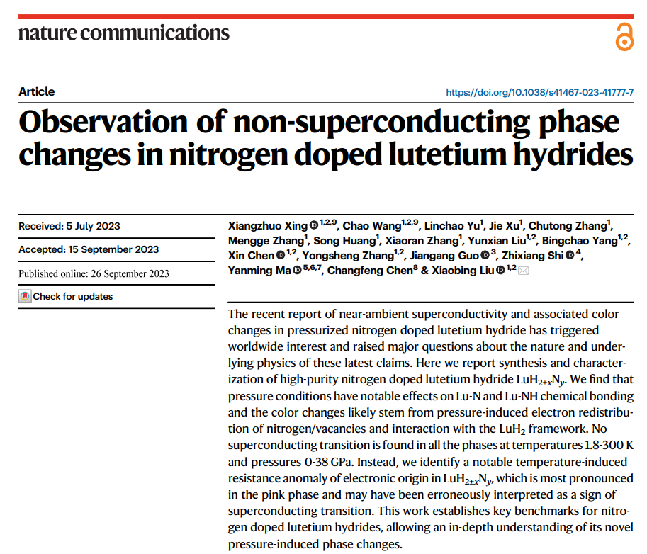 曲阜师大科技处讯 目前,完美网页版物理工程学院刘晓兵教授团队与美国内华达大学陈长风教授、吉林大学马琰铭教授、东南大学施智祥教授、中科院物理所郭建刚研究员等学者合作,在“Lu-N-H体系中潜在近常压室温超导”研究方面获得新进展。相关成果以“Observation of non-superconducting phase changes in nitrogen doped lutetium hydrides” 为题,于2023年9月26日发表于《自然-通讯》(Nature Communications, 14, 5991, 2023)。完美网页版为本论文的第一署名单位和唯一通讯单位,物理工程学院青年副教授邢相灼博士为论文的第一作者,王超副教授为共同第一作者,刘晓兵教授为论文的独立通讯作者。
