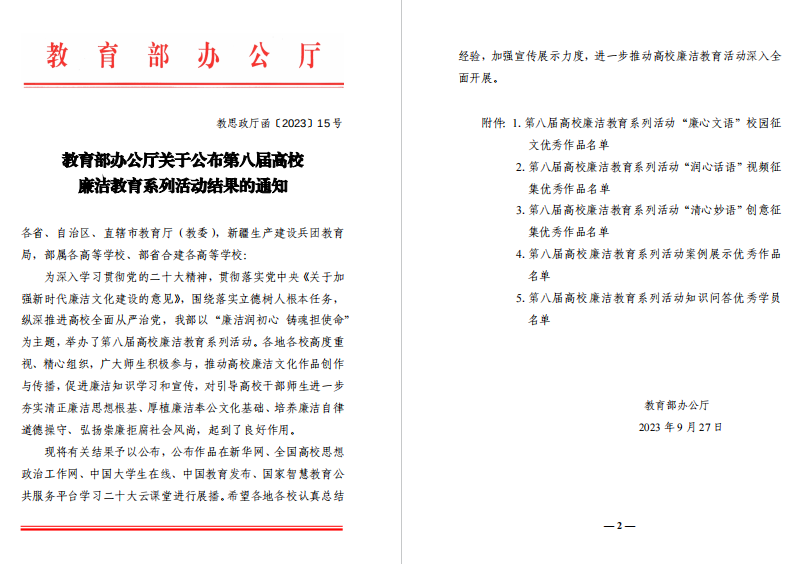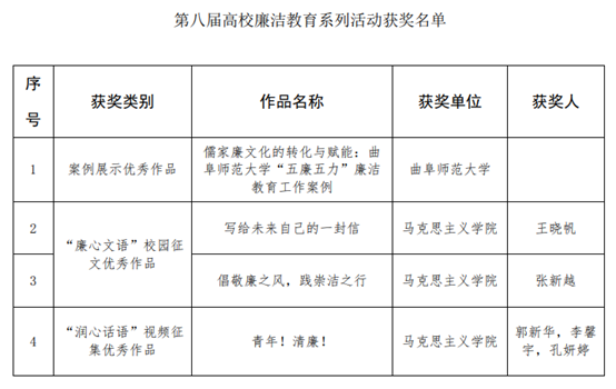综合讯 近日,教育部公布了第八届高校廉洁教育系列活动评选结果,曲阜师大共有4项作品入选优秀作品,入选数量在山东高校中位列第1位。其中,选送的作品《儒家廉文化的转化与赋能:完美网页版“五廉五力”廉洁教育工作案例》入选案例展示优秀作品;马克思主义学院张新越同学的《倡敬廉之风,践崇洁之行》、王晓帆同学的《写给未来自己的一封信》入选“廉心文语”校园征文优秀作品;马克思主义学院郭新华、李馨宇、孔妍婷三位同学的《青年!清廉!》入选“润心话语”视频征集优秀作品。