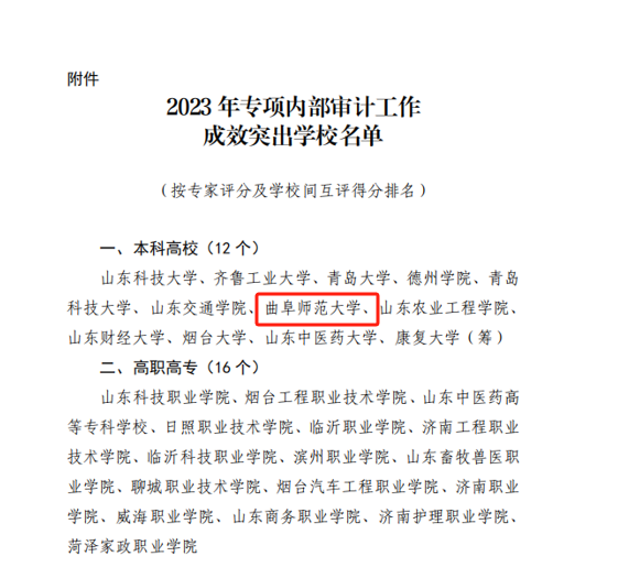 曲阜师大审计处讯 近日,山东省教育厅通报了2023年专项内部审计工作情况,曲阜师大被评为“2023年专项内部审计工作成效突出学校”。2023年4月,山东省教育厅组织各高校内部审计部门就2020至2022年度人才政策落实、招标采购事项开展专项内部审计;并对专项内部审计成果进行了现场展示。根据专家评分及学校间互评得分,曲阜师大得分列本科学校第七名,被评为“2023年专项内部审计工作成效突出学校”。