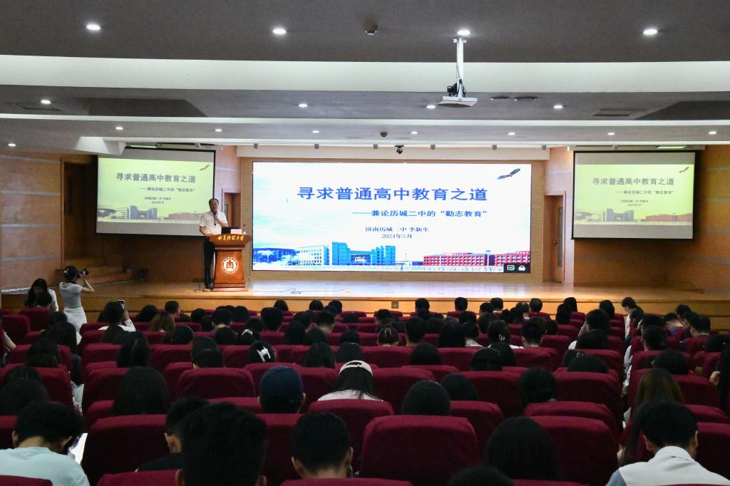 李新生为学校师生作了题为《寻求普通高中教育之道——兼论历城二中的勤志教育》的思政报告,介绍了历城二中如何通过英才教育、科创教育、艺体教育这三张“名片”,为国家人才战略强基铸魂,为融合五育并举筑教育高地,为综合素质提升打造学生高品质精神殿堂,成功地拓展高质量人才培养的宽广道路。并结合个人经历、思考和实践,详细介绍了学校以“勤志”为核心价值观和管理策略的现代化教育治理体系,详细阐释了“勤志文化”的丰富内涵,诠释出坚守中创新教育发展之道的办学哲学,展现了以创新为核心、全面发展为目标的教育理念和方法。