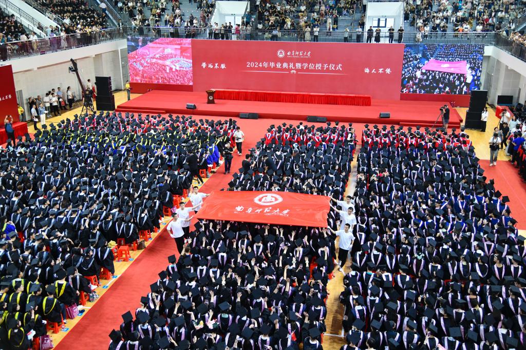 典礼上,精心编排的节目表演为毕业学子送上视听大礼,迅速拉升现场氛围、拨动青春心弦。舞蹈《杏坛弦歌》再现孔子教化的精髓,激发着孔子家乡大学师生矢志为国弘文的使命担当,国风歌曲串烧带着大家重温了美好青春韵律,原创歌曲《再见曲园》诠释出同学们对母校的爱与不舍,经典旋律《我爱你中国》唱出了毕业学子的赤热爱国之情。全场合唱校歌、传递校旗的环节,让同学们在浓浓的仪式感中再次拉满曲园人的荣誉感。