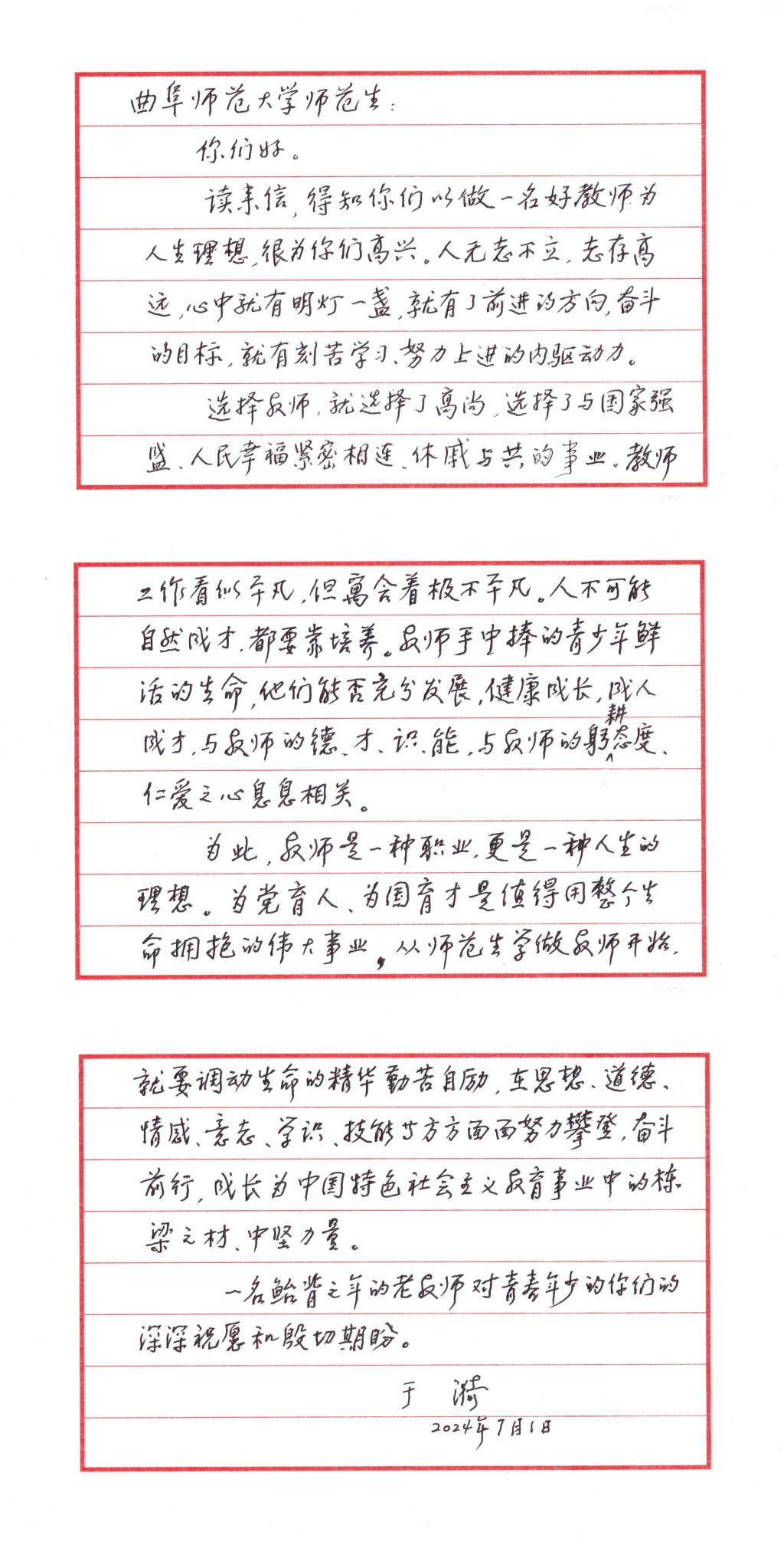 一直以来,完美网页版把办好师范教育作为第一职责,充分发挥传统文化优势,着力培养德才兼备的大国良师。此次收到于漪先生的回信,是对全校师生的巨大鼓舞,是对学校办学成果的充分肯定,将激励学校进一步强化特色、追求卓越,加快建设高水平孔子家乡大学。