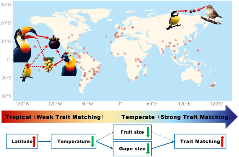 “通过长期的自然观察、精心的设计实验以及系统的数据分析,才能真正洞悉动植物之间相互作用的复杂机制。”易现峰教授自2005年起投身于野外定位研究、深耕动植物协同进化领域。他介绍,物种间功能性状匹配被认为是维持生态互作网络稳定性的重要机制。传统生态学理论推测,生物多样性较高的热带地区应表现出更强的互作特异性。然而,这一假说在全球尺度上尚未在动植物协同进化领域获得充分的实证支持,而易现峰教授团队的此次研究发现:在高纬度地区,鸟喙大小与果实大小的匹配程度更高,这首次揭示了性状匹配强度随纬度升高而增强的反直觉规律。