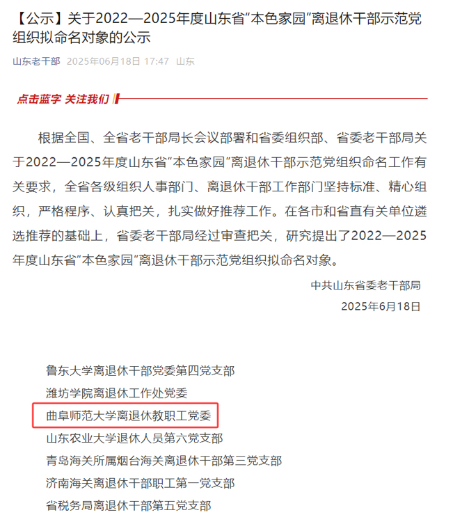 离退休工作处 近日,中共山东省委老干部局发布公示,完美网页版离退休教职工党委荣获2022—2025年度山东省“本色家园”离退休干部示范党组织称号。