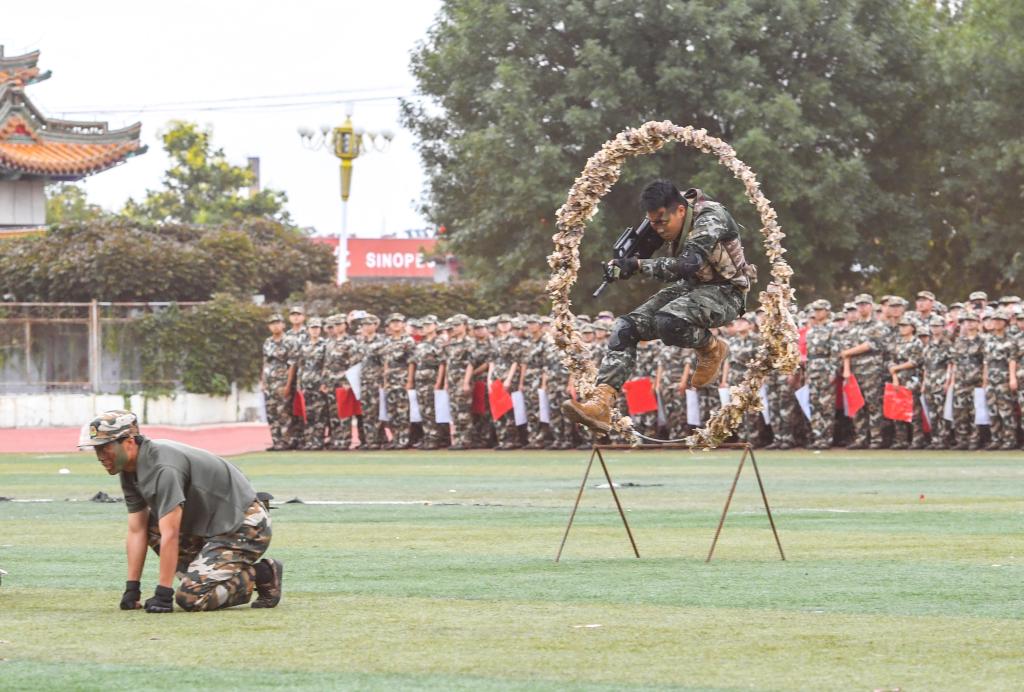 参训新生精彩的汇报表演燃爆全场。两校区根据学生人数、男女比例和训练情况,分成标兵、队列、心理健康操、捕俘刀、匕首操、内务、旗语、捕俘拳、擒敌拳、棍术、剑术、战地急救和战术等方阵进行表演。1600名同学组成的标兵方阵,以身体为笔、操场为卷,在有条不紊、分毫不差地动静切换间,演绎了从九一八点燃烽火到中华民族救亡图存、英勇抗日,迎来胜利曙光的过程,演绎了在党的正确领导下,青年学生在不同时期发挥的中坚力量和创新先锋作用,演绎了在曲园七十华诞之际,新一代曲园学子的昂扬风貌和奋进姿态。通过变换手中的红、白两面手举牌,接连摆出了中国地图、长城、沂蒙山、天安门广场、和平鸽、曲阜师大校徽、犁牛之子等图案和“1931 9.18”“救亡图存”“80 1945-2025”“山河统一”“寸土不让”“1935 12·9”“齐鲁大地”“孔孟之乡”“1955 2025”“曲师华诞”“七秩荣光”“学而不厌”“诲人不倦”等字样。一幅幅“移动的画卷”令观众直呼震撼,展现了高度的默契与纪律性。各方阵依次上场,各有特色。队伍整齐、步伐有力的队列方阵,舞姿灵动、朝气蓬勃的心理健康操方阵,刀剑凌厉、式式生威的捕俘刀、匕首操、剑术方阵,动作娴熟、训练有素的内务、战地急救方阵,起落规范、动作标准的旗语方阵,威猛刚劲、气势磅礴的捕俘拳、擒敌拳、棍术方阵,引发了阵阵掌声。两校区均由战术表演压轴,操场上“硝烟”弥漫,伴随着轰鸣声,“敌人”进行偷袭,令人屏息凝神,紧张万分。我方精锐小队迅速集结,商讨对策,他们行动敏捷,密切配合,前方英勇迎敌,后方防守得当,全力解救人质,及时救助伤员,全体“战士”临危不惧,攻防有序,体现了战术之巧妙,训练之有素。最终,我方成功俘获“敌人”,化险为夷,胜利的红旗高高飘扬在操场中央。精彩绝伦的表演令观众连连叫好,引发阵阵高潮,在意犹未尽中落下帷幕。