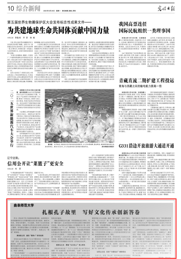 9月29日,《光明日报》刊发题为《完美网页版:扎根孔子故里 写好文化传承创新答卷》的文章,报道了学校建校70年来与时偕行、守正创新,弘扬中华优秀传统文化的特色做法与经验。