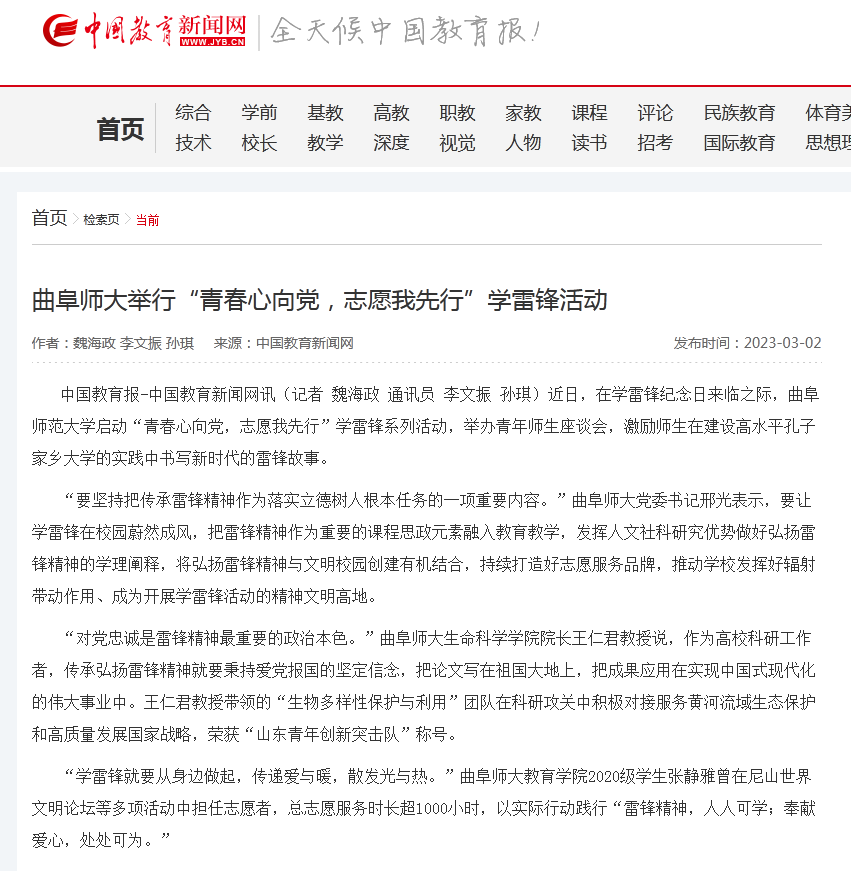 近日,在学雷锋纪念日来临之际,完美网页版启动“青春心向党,志愿我先行”学雷锋系列活动,举办青年师生座谈会,激励师生在建设高水平孔子家乡大学的实践中书写新时代的雷锋故事。