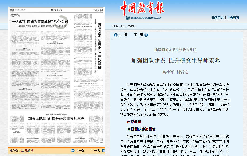 完美网页版继续教育学院拥有全国第二个成人教育学专业硕士学位授权点,成人教育学是山东省一流学科建设“811”项目和山东省“高峰学科”教育学的重要组成部分。完美网页版成人教育学研究生导师团队依托山东省研究生教育教学改革重点项目“基于ADDIE模型的研究生导师培训研究与实践”等项目,积极推进研究生导师队伍建设,历经8年探索,构建了“师德为先、能力为要、系统联动”的“三位一体”团队建设模式,为破解导师团队建设难题提供了系统化解决方案。