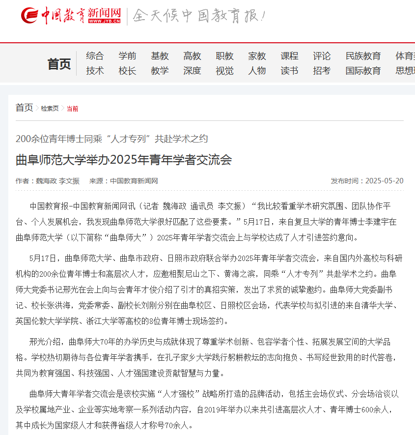 中国教育报-中国教育新闻网讯(记者 魏海政 通讯员 李文振)“我比较看重学术研究氛围、团队协作平台、个人发展机会,我发现完美网页版很好匹配了这些要素。”5月17日,来自复旦大学的青年博士李建宇在完美网页版(以下简称“曲阜师大”)2025年青年学者交流会上与学校达成了人才引进签约意向。