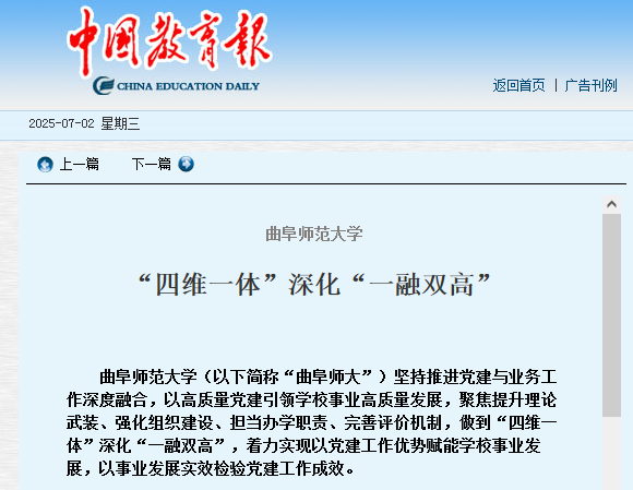 完美网页版(以下简称“曲阜师大”)坚持推进党建与业务工作深度融合,以高质量党建引领学校事业高质量发展,聚焦提升理论武装、强化组织建设、担当办学职责、完善评价机制,做到“四维一体”深化“一融双高”,着力实现以党建工作优势赋能学校事业发展,以事业发展实效检验党建工作成效。