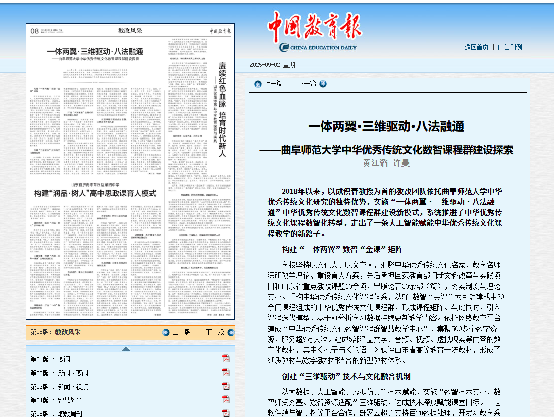 学校坚持以文化人、以文育人,汇聚中华优秀传统文化名家、教学名师深研教学理论、重设育人方案,先后承担国家教育部门新文科改革与实践项目和山东省重点教改课题10余项,出版论著30余部(篇),夯实制度与理论支撑。重构中华优秀传统文化课程体系,以5门数智“金课”为引领建成由30余门课程组成的中华优秀传统文化课程群,形成课程矩阵。与此同时,引入课程迭代模型,基于AI分析学习数据持续更新教学内容。依托网络教育平台建成“中华优秀传统文化数智课程群智慧教学中心”,集聚500多个数字资源,服务超9万人次。建成5部涵盖文字、音频、视频、虚拟现实等内容的数字化教材,其中《孔子与〈论语〉》获评山东省高等教育一流教材,形成了纸质教材与数字教材相结合的新型教材体系。   创建“三维驱动”技术与文化融合机制   以大数据、人工智能、虚拟仿真等技术赋能,实施“数智技术支撑、数智师资夯基、数智资源适配”三维驱动,达成技术深度赋能课堂目标。一是软件端与智慧树等平台合作,部署云超算支持百TB数据处理,开发AI教学系统;硬件端建成历史文化虚拟仿真实验中心和中华优秀传统文化智慧课程教研中心,配置百万级文化数据库。二是与东中西部高校建成5个师资跨域协同虚拟教研室,实现教案共研、课程共创、课堂共建和资源共享。三是依托智慧教育平台构建智能推荐多模态资源库,基于学情分析精准推送教学资源;自建的3个虚拟仿真平台,嫁接531个文化场景实验,学生实验满意度达96%。   打造“八法融通”全链式数智协同育人模式   课程群构建了“四策贯通+四域联动”的“八法融通”全链式数智协同育人模式,打通“设计—教学—实践—评价—协同”育人全环节,满足学生差异化学习需求,提升高阶能力培养水平。在教学方法上,推进“认知智能优化教学设计、智能技术驱动高阶学习、智慧平台赋能教学实践、智评机制贯穿教学评价”四策贯通。   课前基于学情生成N种个性化学案,AI辅助生成精准化教案,构建智慧预学系统;课中依托智慧学习平台和知识图谱实现知识精准传递,文化AI智能体和VR场景推动价值高阶转化;课外开发智慧实践专区,设置文化传播、美德践行、项目赛事三个板块,全面提升学生文化素养与实践能力;智评机制基于180万条学习交互数据,以数据驱动、评价驱动、系统自驱动实现精准画像、精准诊断、精准干预。在优资协同上,实行“校际云联、社区辐射、政企合作、国际交流”四域联动,构建教育共同体。以云联课堂和虚拟教研室实现东中西部35所院校共建,实现教案共研、课程共创、课堂共建和资源共享;以强大课程资源辐射200余村社,累计服务5万余人,获评省级社区教育优秀课程资源;联合42家企事业单位共建研学、实习、就业基地,与曲阜文化示范区、济宁政德教育干部学院共建共享课程;依托“华文教育基地”开展中外文化交流活动,学校国际学院采用英语版虚拟仿真实验课程教学。   数智课程群建设成效显著,示范引领作用凸显   中华优秀传统文化课程群建设在信息技术和育人范式上实现了新突破。首先,在技术方面实现了文化与数智深度融合。文技融合产生了以下三个明显效果:知识生动化,开发中华优秀传统文化NLP系统,内化百万文化语料,精准具象传递知识;认知拟人化,打造文化交互智能体,具备类人思维和语义生成能力,支持典籍解读与思辨对话;价值显性化,以AI动态关联前沿资讯,激活中华优秀传统文化时代生命力,融合真善美相关元素,赋能课程思政。其次,创新中华优秀传统文化育人范式,探索了“价值引领·技术融合·三全育人”新文科建设路径。课程教学立足立德树人根本使命,实现中华优秀传统文化教育效能的高阶跃升:以价值为魂,确保技术赋能始终服务于文化传承;以融合为要,实现数智技术与文化育人在“目标、内容、方法、实践、评价、协同”方面的全面融合;以育人为本,构建跨校际、跨地域、跨领域的“三全育人”网络,形成多元主体共创的文化教育共同体。该路径有效促进了优质资源共享与复合型文化人才协同培养,推动了中华优秀传统文化的创造性转化与创新性发展。   经过7年实践,中华优秀传统文化数智课程群育人成效显著。课程覆盖全国230所高校,累计教授9.6万余名学生,教学互动量达180万次,学生获省级以上奖励110余项,涌现出先进典型200余人。教学团队建设卓有成效,已建成“国家人才领军—省级专家支撑—青年骨干接力”的跨学科师资梯队,5人获儒学研究领域“泰山学者”称号,1人获评省级教学名师,2人获评山东省智库高端人才。课程建设成效明显,入选国家一流课程3门、省级一流课程5门、全国高校“慕课十年典型案例”。课程群的示范效应广泛显现,被多家主流媒体报道30余次,课程群建设模式被35所高校采用,构建了覆盖东中西部的高校中华优秀传统文化育人网络。   完美网页版中华优秀传统文化数智课程群建设,以立德树人为根本任务,以课程体系重构、技术赋能、教法革新、优资协同四大核心要素为支撑,实现了数智条件下文化精准传承、课堂效能跃升、优资协同共享,为数智时代人文课程建设提供了参考经验。  |