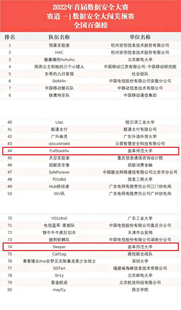 我校网络空间安全学院学子在本赛中表现优异,由何天晴、陈智宇、孙祥森组成的FullStackfw队,周博、焦玉山、高清华组成的Sleeper队在王玉田和臧小东老师的带领下,进入全国百强榜,分获第44位和74位,2022年年底将代表学校参加在中国数据安全产业峰会上举办的全国总决赛。