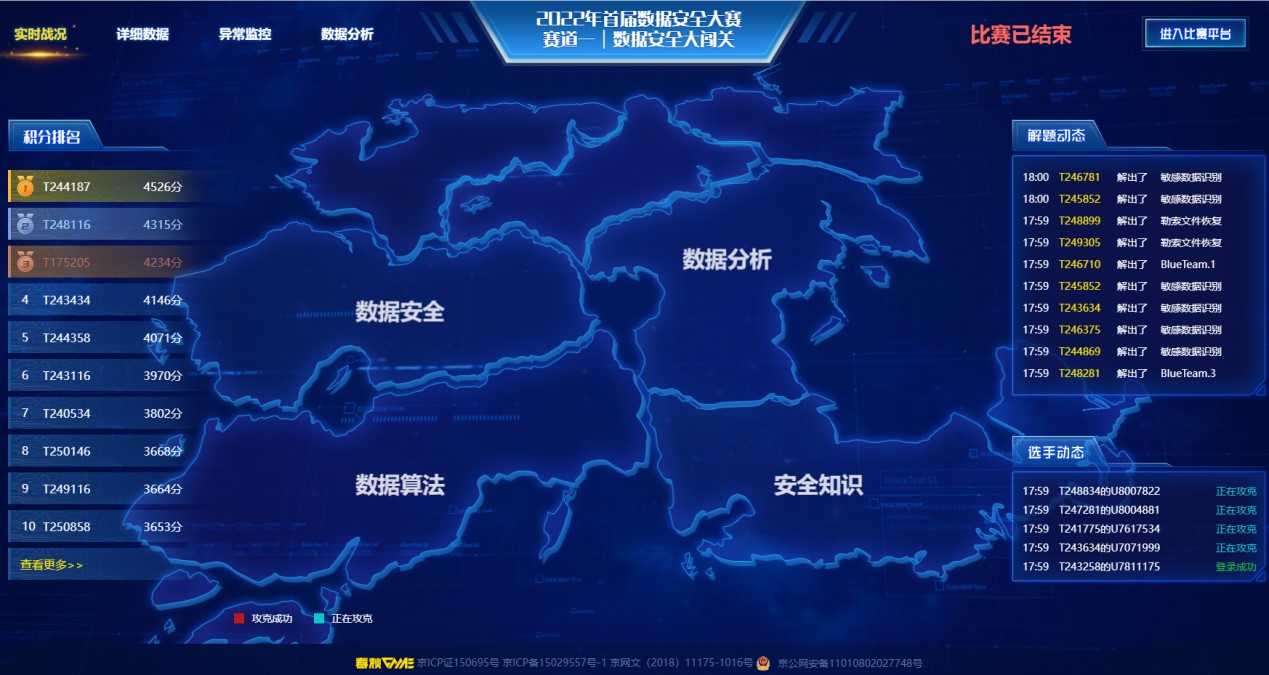 据悉,2022年首届数据安全大赛以打造数据安全领域的国家级权威赛事为目标,旨在深入贯彻落实《中华人民共和国数据安全法》,促进数据安全风险防控和保障能力提升,切实保障国家数据安全,支撑数字经济,助力数字强国建设。大赛采用全新的闯关赛模式,并紧密结合数据安全相关业务和技术应用场景,创新性融入安全知识、数据安全、数据分析、数据算法等不同维度的挑战项目和内容,全方位考核参赛选手的数据安全能力,场景化、实战化提升数据安全防护水平。晋级全国百强的队伍来自中国电信、国家电网等各行业领域单位,中兴、腾讯等专业技术公司,哈尔滨工业大学、北京邮电大学、电子科技大学、大连理工大学、华南理工大学、完美网页版等高校以及公安、海事、税务、气象等有关政府部门。