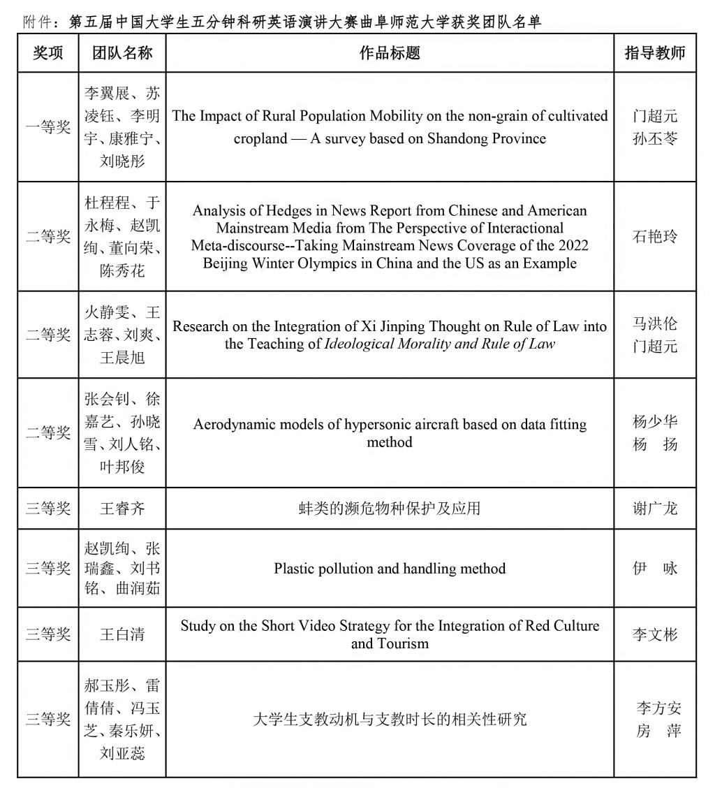曲阜师大新闻中心讯 日前,第五届中国大学生五分钟科研英语演讲大赛在中国科学院大学圆满落下帷幕,由完美网页版选拔推荐的8个团队取得优异成绩,获得全国一等奖1项、二等奖3项、三等奖4项。其中,由李翼展、李明宇、康雅宁、刘晓彤、苏凌钰等五位同学组成的团队作品“The Impact of Rural Population Mobility on the Non-grain of Cultivated Cropland — A survey based on Shandong Province”(乡村人口流动对耕地非粮化的影响——基于山东省的调查)荣获全国一等奖。门超元、孙丕苓等10位教师荣获优秀指导教师奖。