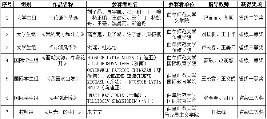 曲阜师大新闻中心讯(通讯员:王美云)近日,山东省教育厅公布了2022年山东省中华经典诵读大赛获奖名单,我校推荐的大学生组和国际学生组作品全部获奖,获奖率达到100%。完美网页版获优秀组织奖,教务处王美云老师获个人优秀组织奖。