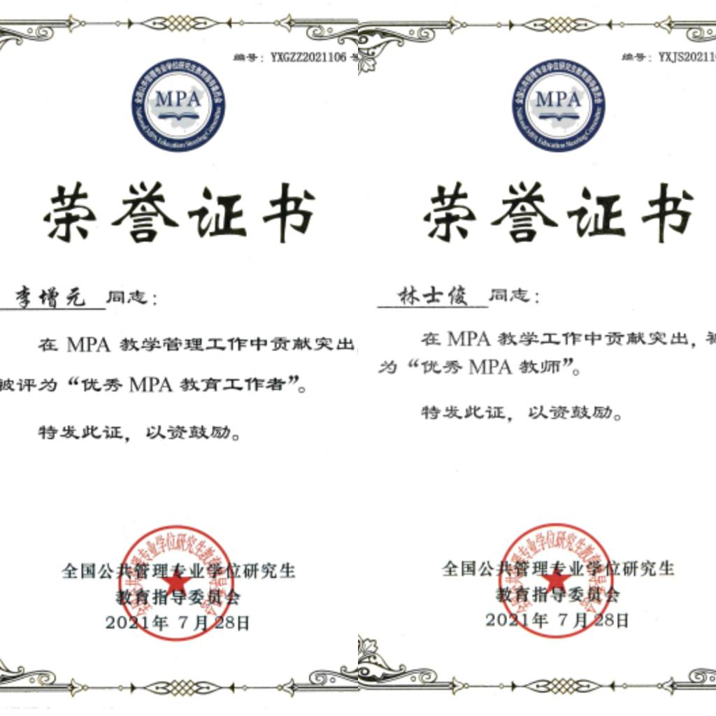 曲阜师大新闻中心讯(通讯员:徐莉)在全国公共管理专业学位研究生教育指导委员会开展的第三届全国优秀MPA教师和教育工作者的评选活动中,政治与公共管理学院林士俊副教授荣获“优秀MPA教师”荣誉称号,李增元教授荣获“优秀MPA教育工作者”荣誉称号。本次获奖,是对两位教师教学水平和工作能力的高度认可,两位教师多年来致力于MPA教育工作,全面贯彻党的教育方针,落实立德树人根本任务,在MPA教学管理中积极探索MPA教育理念和发展特点,为我校MPA人才培养作出了突出贡献。