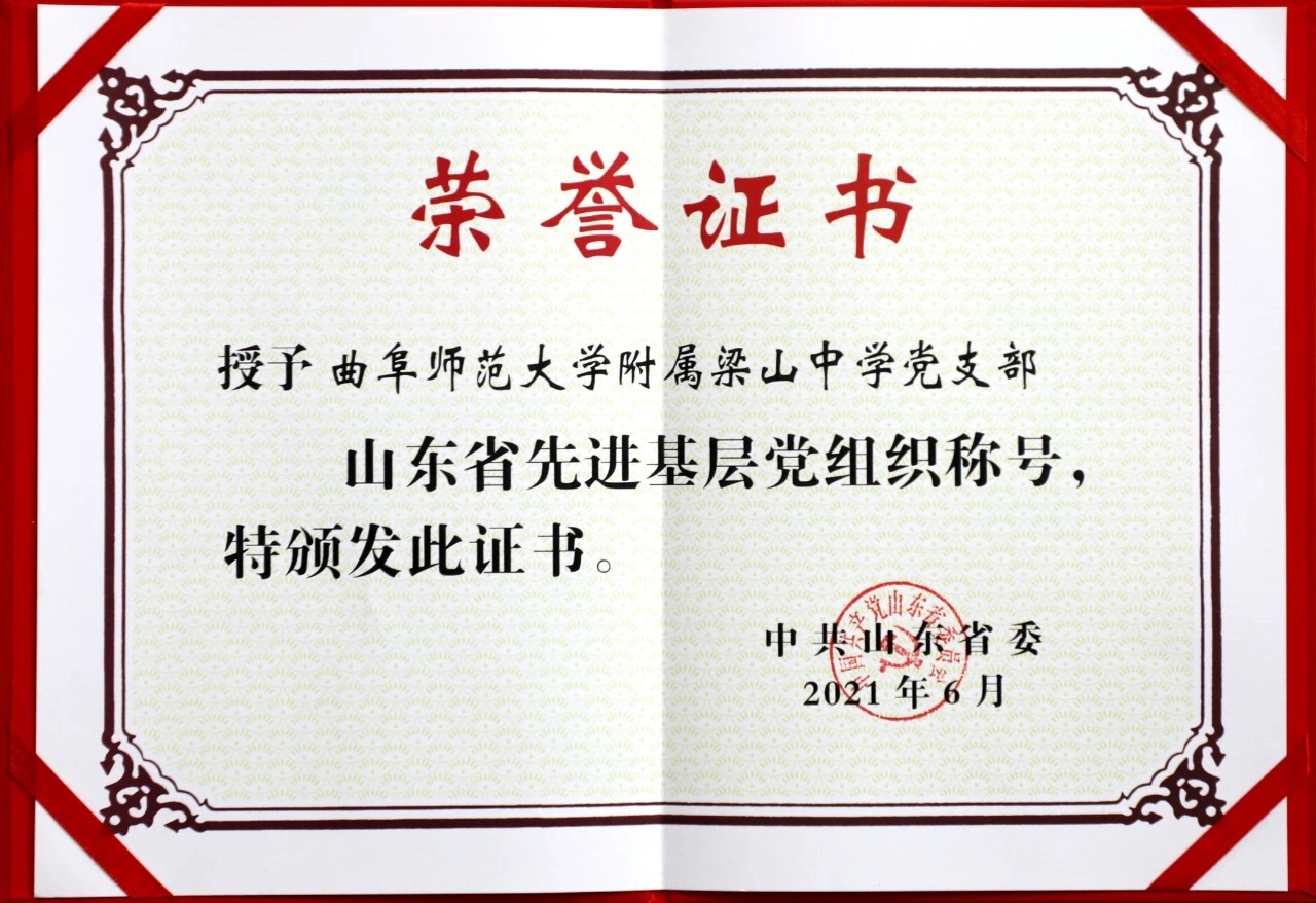 曲阜师大新闻中心讯 日前,中共山东省委印发《中共山东省委关于表彰山东省优秀共产党员、优秀党务工作者和先进基层党组织的决定》,完美网页版附属梁山中学党支部荣获“山东省先进基层党组织”称号。
