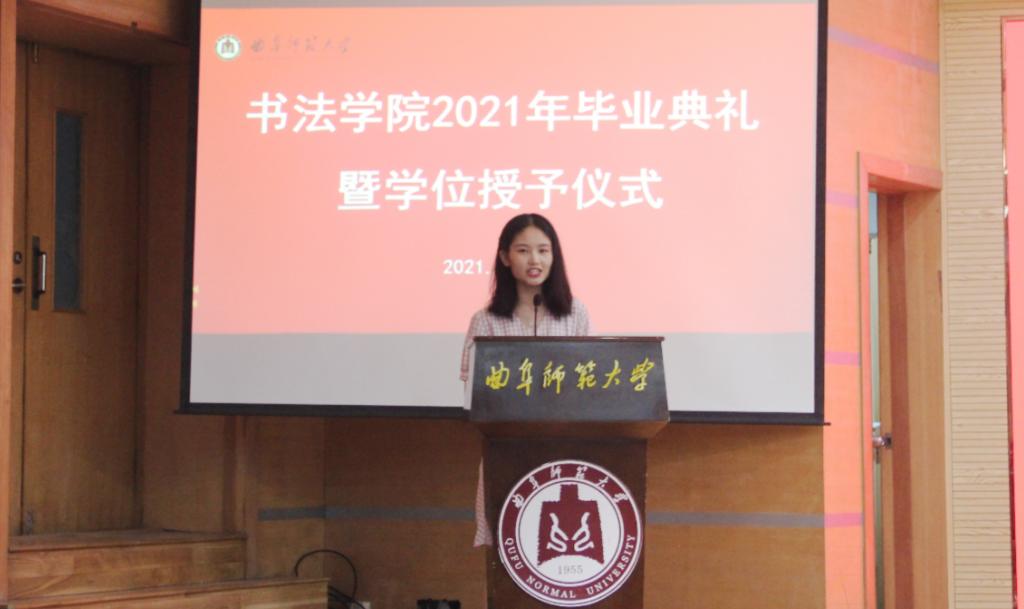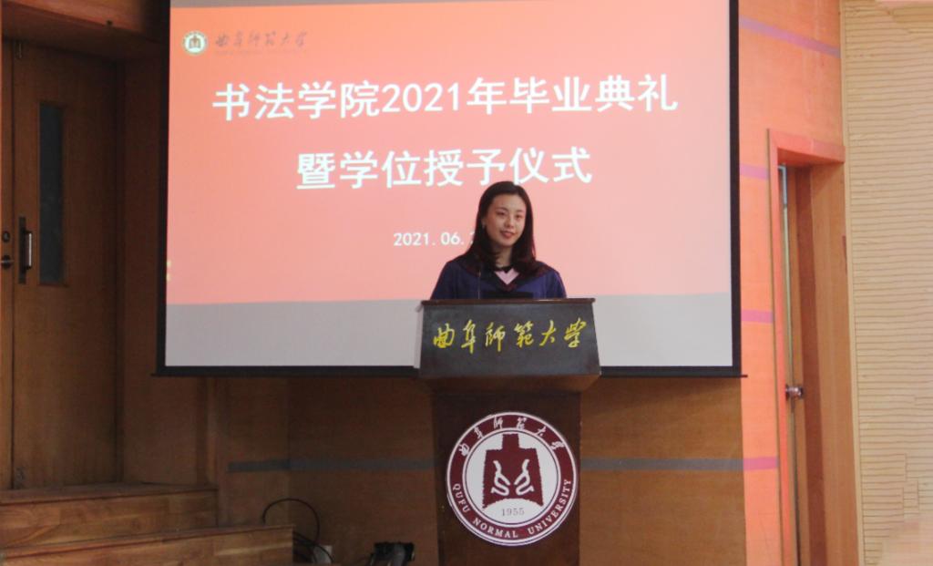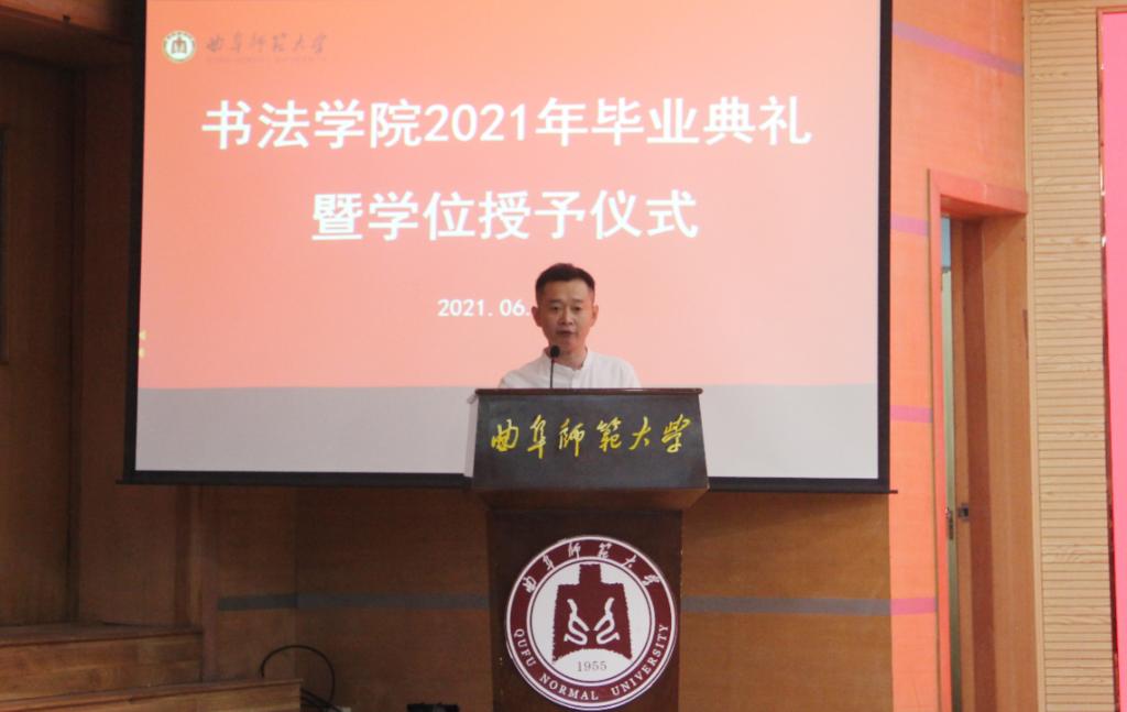 曲阜师大新闻中心讯(通讯员:薛翠)6月26日上午九点,书法学院2021年毕业典礼暨学位授予仪式在我校孔子会堂隆重举行。学院党委书记院长刘建新、副院长陈涛、院长助理乌峰、徐传法,及学院各教研室主任、各年级辅导员、2021届毕业生和在校学生代表共同出席。典礼由学院党委副书记胡乃永主持。