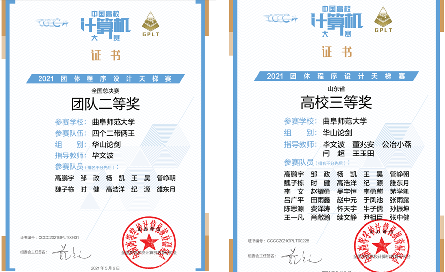 曲阜师大新闻中心讯(通讯员:毕文波 王玉田) 4月24日,第六届中国高校计算机大赛-团体程序天梯赛线上线下同时进行,完美网页版计算机学院、网络空间安全学院共组建五支队伍参加了比赛。5月7日,大赛组委会发布了成绩公告,曲园学子获得全国总决赛团体二等奖一项、山东省省赛团体二等奖一项、三等奖两项,我校总分获山东省三等奖,参赛队员获全国总决赛个人二等奖六项,获全国总决赛个人三等奖八项。