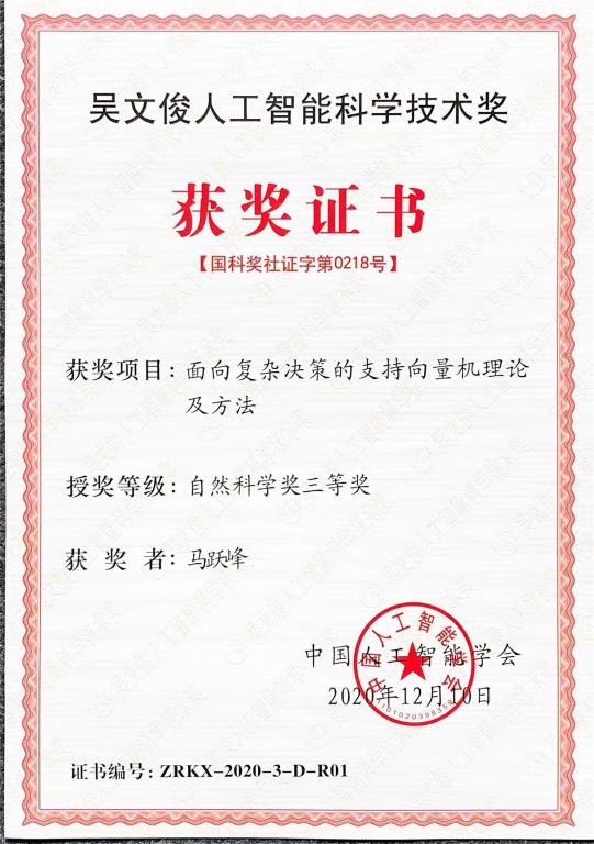 曲阜师大新闻中心(通讯员:朱年磊)我国智能科学技术领域重要奖项“吴文俊人工智能科学技术奖”10日在京揭晓,曲阜师大计算机学院马跃峰副教授以第一完成人、曲阜师大以第一完成单位申报的“面向复杂决策的支持向量机理论及方法”获得第十届吴文俊人工智能自然科学奖三等奖,这是学校在人工智能领域获得的突破性成果。
