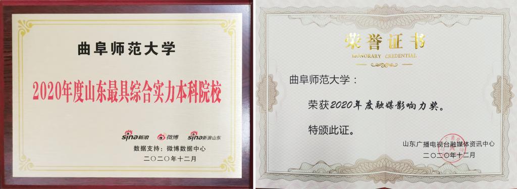 在“2021山东广电教育产业创新发展论坛暨首届融媒影响力奖颁奖仪式”,我校荣获“2020年度融媒影响力奖”,刘萌被评为“2020年度山东广播电视台优秀融媒通讯员”。在齐鲁晚报·齐鲁壹点和山东省新闻摄影协会举办的的2020高校融媒传播论坛中,我校荣获2020年度融媒传播最具影响力高校,同时被评为“寻找山东最美大学校园”微视频、摄影大赛组织单位。在由新浪网、微博、新浪山东联合主办的2020年度山东教育盛典发布荣耀榜单,我校荣获“2020年度山东最具综合实力本科院校”奖。
