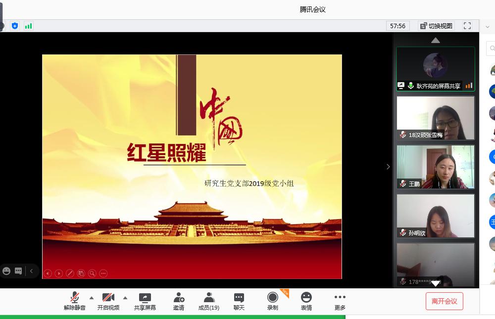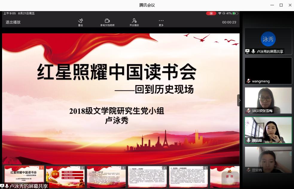 曲阜师大新闻中心讯 8月21日上午,文学院研究生通过腾讯会议开展了以品读《红星照耀中国》为主题的线上红色读书会主题党日活动。活动由党支部书记魏舒欣主持,2018、2019级党小组参与会议,会上两个党小组的党员同志结合自身专业学习、学术特色和个人实践经历,分享了对《红星照耀中国》的理解和感悟。