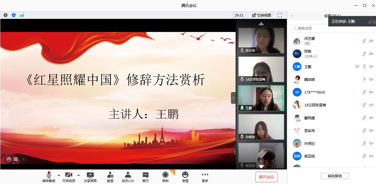 2018级党小组的党员同志从文学作品赏析的视角,带领大家进行共同学习和赏析作品。卢泳秀同志从文学体裁、作品内容两个方面介绍《红星照耀中国》,与大家分享了自己的个人感受“读史明智——传承革命精神”,与人民打成一片的优秀中国共产党领袖,是一群敢爱敢恨,真心的为人民服务的共产党员,这让我们深切地认识到了共产党与人民的生活是密不可分的,这种感情源自于对祖国的热爱;马聪丹同志按照时间顺序介绍毛泽东同志的成长历程,一个共产党需要经历一番艰难的斗争才能逐渐成长起来,作为青年人,我们也要有成为一名合格共产党员的决心;王鹏同志从修辞方法的角度找出《红星照耀中国中》典型的修辞使用,介绍了借代、比喻、反问、设问、多种修辞方法的综合运用;张雪梅从她个人的读书初体验出发选取了三个片段进行赏析,并结合个人实践经历,谈了谈在汉语国际教育的实践中,我们的使命是传播中国优秀传统文化,做好汉语的传播者。屈安冉在分享中谈到,这部作品让我们再一次深刻体验了“不忘初心、牢记使命”。共产党宛如一颗光华璀璨、熠熠闪亮的“红星”,永远照耀朝气蓬勃的中国。