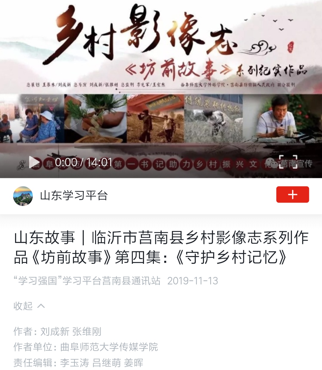 在刘成新、张维刚两位老师的指导下,学院师生拍摄的乡村影像志系列作品《坊前故事》(共6集)在学习强国山东学习平台的“山东故事”栏目展播,该作品同时在人民网视频频道和《求是》杂志社主管的“圆点直播”等多家新媒体平台发布展播。由赵鑫老师指导的纪录片《我们在安家村搭了一个戏台子》《京舞门》分别在学习强国山东学习平台的“城乡新貌”和“山东故事”栏目展播。统计数据显示,上述作品在相关平台的播放量已经超过十万次,产生了比较广泛的反响。