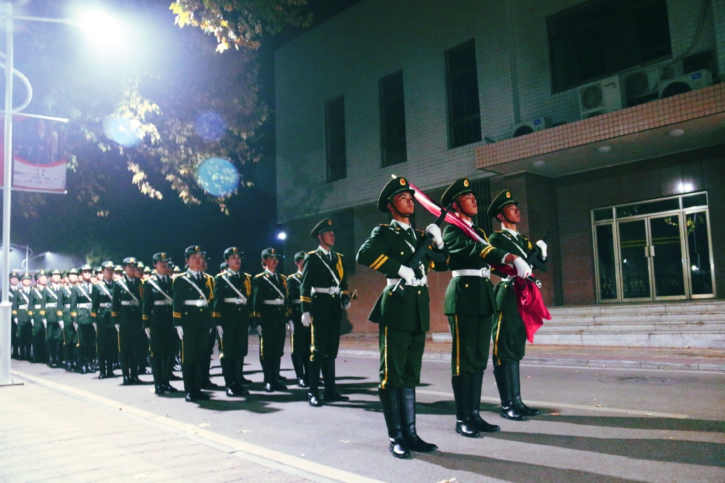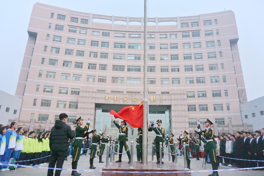 升国旗仪式上,伴随着激扬的进行曲,国旗护卫队旗手精神抖擞,以饱满的精神状态,整齐划一的步伐,庄严肃穆的护卫五星红旗进场,五星红旗在气势恢宏的《义勇军进行曲》中冉冉升起,全体师生向国旗行注目礼,表达对祖国的崇高敬意。