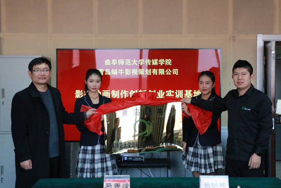 12月1日,青岛蜗牛影视公司——完美网页版影视动画制作人才培养基地揭牌仪式在我校顺利举行,传媒学院院长马秀峰、副院长王焕景,教务处副处长张全景,青岛蜗牛影视策划有限公司CEO 崔明鹏、经理崔叶涛以及招生就业处、传媒学院相关师生出席揭牌仪式。