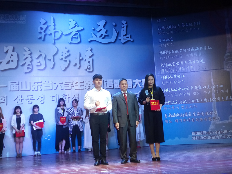“韩音逐浪,海韵传情”——第十一届山东省大学生韩国语歌唱大赛5月7日在哈尔滨工业大学(威海)举行。来自省内43所高校的韩国语专业师生参与了本次活动。我校2014级韩国语专业盛祝松同学以一曲经典的《난 아직 모르잖아요》赢得了现场观众的热烈掌声和评委们的一致认可,最终荣获大赛二等奖。指导教师黄婧获优秀指导教师奖。