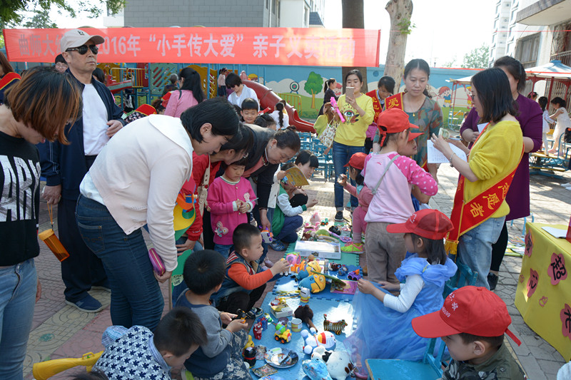 “快来买啊,快来买啊,大家快来献爱心啊,爱心超市的东西最好了!”伴随着小朋友们稚嫩的叫卖声,4月29日下午,曲师大幼儿园义卖活动如期举行。