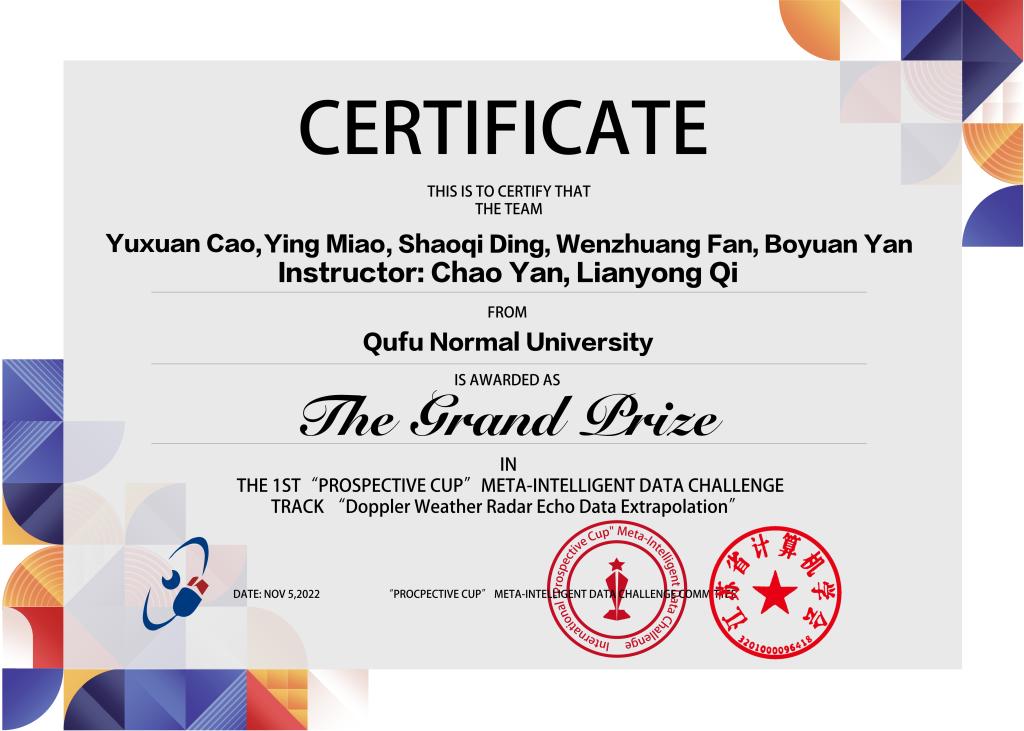 曲阜师大新闻中心讯 近日,由第十二届计算机工程与网络国际会议(CENet2022)发起的首届国际“远见杯”元智能数据挑战大赛(中国科协欧洲(比利时)海智创新创业基地、江苏省计算机学会主办)在海南省海口市落下帷幕。大赛采取赛道制,分为“火灾下混凝土温度孔压时空演化学习”、“音乐驱动的指挥动作生成”、“沉积学知识图谱中实体识别”、“多普勒天气雷达回波数据外推”四个赛道。其中,由完美网页版计算机学院闫超、齐连永老师指导,曹宇轩、苗影、丁少奇、樊文壮和闫博远等研究生完成的参赛作品:A Doppler Weather Radar Echo Data Extrapolation Model Based on MultiConvARIMA,喜获大赛唯一特等奖(奖金1万元)。
