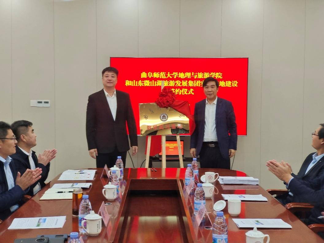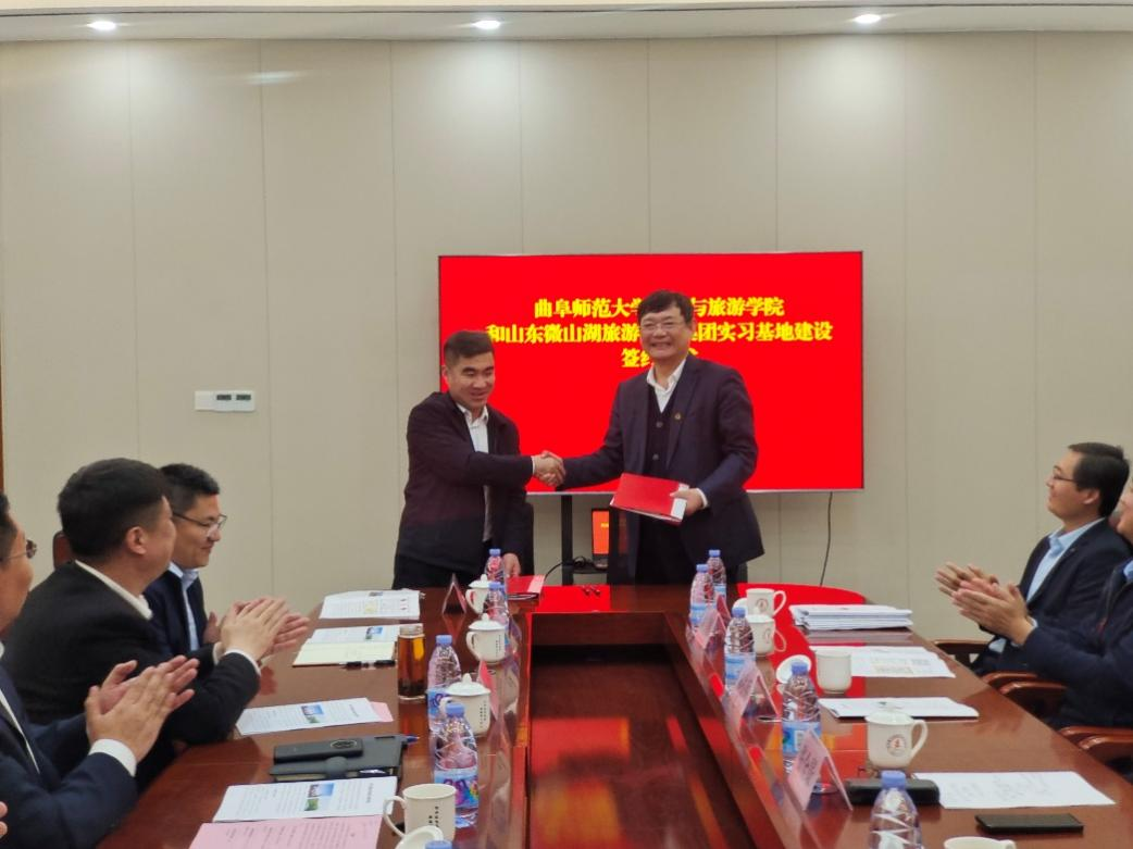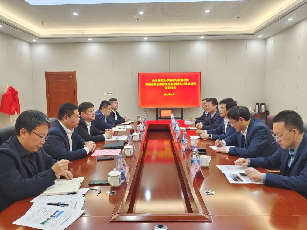 曲阜师大地理与旅游学院讯  为进一步推进校地融合发展,4月11日,地理与旅游学院与山东微山湖旅游发展集团举行共建教学实习基地签约仪式。学院党委书记苏占兵、院长张全景等领导班子成员,微山岛旅游度假区管理服务中心党组书记朱峰,微山县文旅局党组书记、局长王宁,微山县县委第四巡查组组长彭凡民,微山湖旅游发展集团董事长赵立国,微山县文旅局副局长武传震共同出席活动。