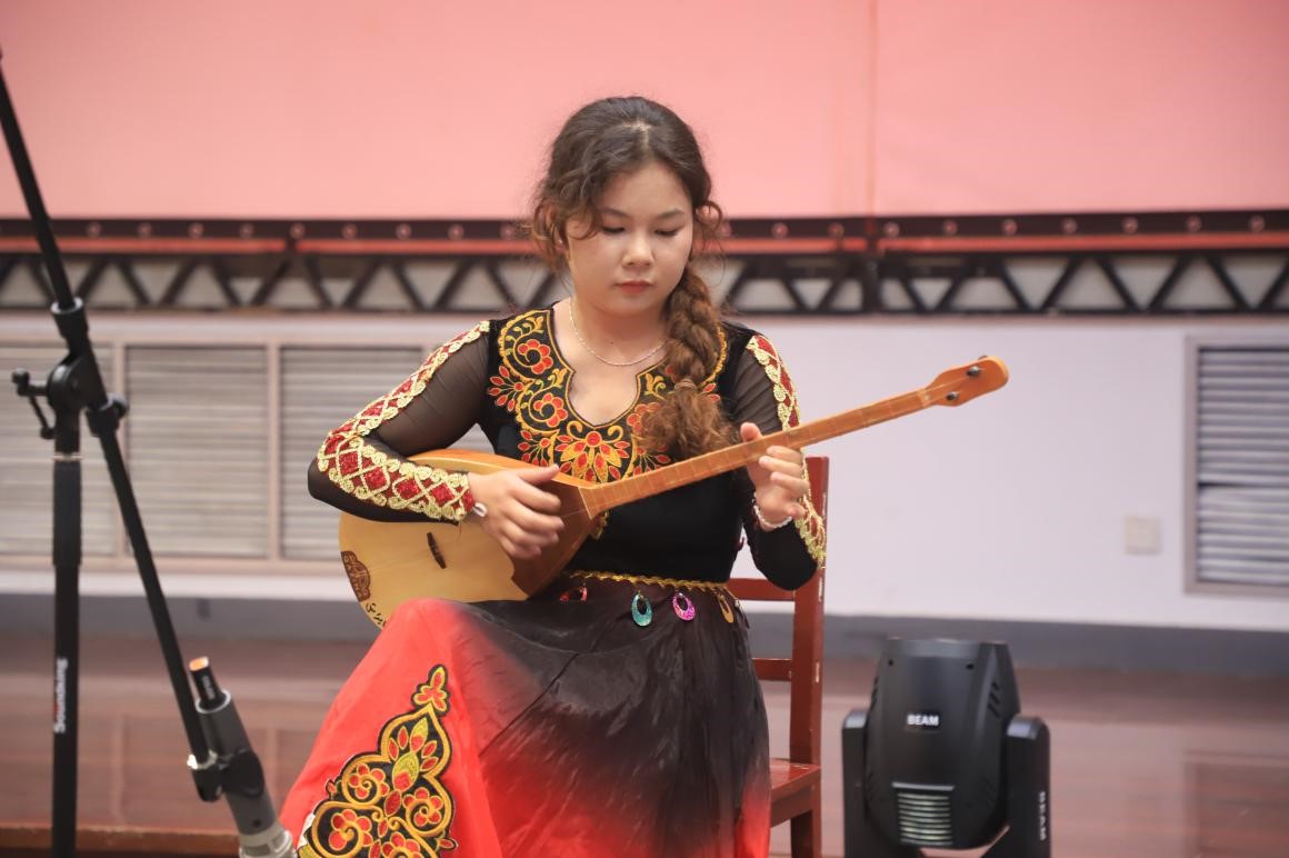 座谈会以热情洋溢的《舞蹈串烧》拉开序幕。身着绚丽民族服饰的同学们以灵动的舞姿展现了独特的民族文化魅力,赢得观众的阵阵掌声。随后,悠扬的冬不拉演奏缓缓响起,将大家带入广袤无垠的草原,也让现场观众充分领略到多元民族文化交融之美。