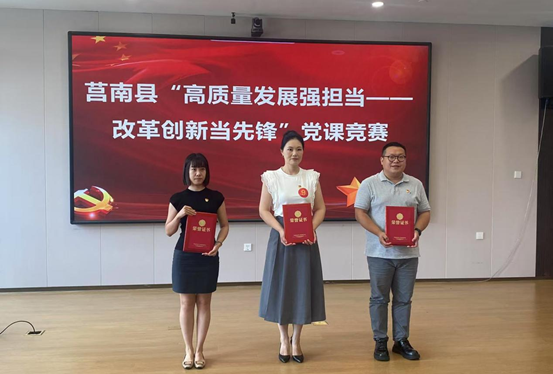党委组织部、文学院讯  8月7日,莒南县举办“高质量发展强担当,改革创新当先锋”主题党课竞赛,持续深化“党课开讲啦”活动成效,更好地教育引导广大党员在抓改革创新中当先锋、做表率。经过激烈角逐,学校选派第一书记、文学院辅导员刘怀峰凭借出色表现荣获一等奖。