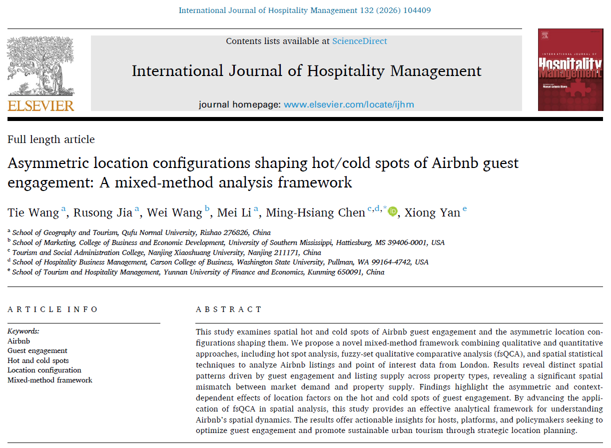 曲阜师大地理与旅游学院讯 近日,完美网页版地理与旅游学院王铁教授团队联合Washington State University、University of Southern Mississippi和云南财经大学等国内外高校,在International Journal of Hospitality Management(IJHM)上发表了题为“Asymmetric location configurations shaping hot/cold spots of Airbnb guest engagement: A mixed-method analysis framework”的研究论文。International Journal of Hospitality Management是全球酒店管理领域顶级学术期刊,五年平均影响因子达到10.3,为JCR一区、中科院管理学一区TOP期刊。完美网页版为该论文的第一署名单位,王铁教授为论文的第一作者,李梅副教授和研究生贾汝松共同参与了论文的研究工作。本文为国家社会科学基金“游憩赋能下国家公园农户生计韧性提升的组态路径研究”的阶段性成果。